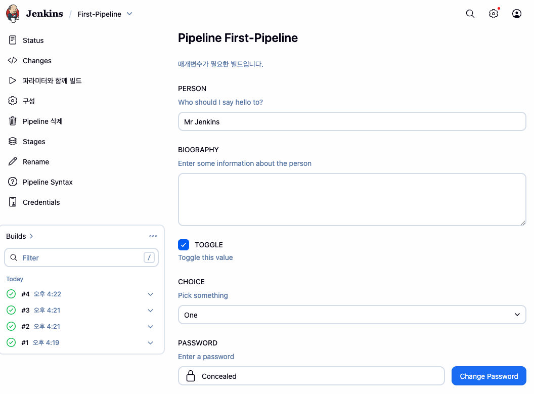 아래 처럼 수정 후 확인: 파라미터와 함께 빌드 → Console Output 확인 ⇒ 다시 한번 더 빌드 클릭 (변수 입력 칸 확인)