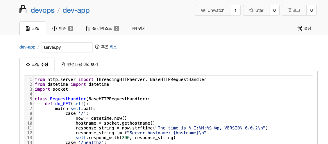 코드에서 위와같이 push 해도 되지만 gogs 웹에 접근해서 직접 수정하겠습니다.