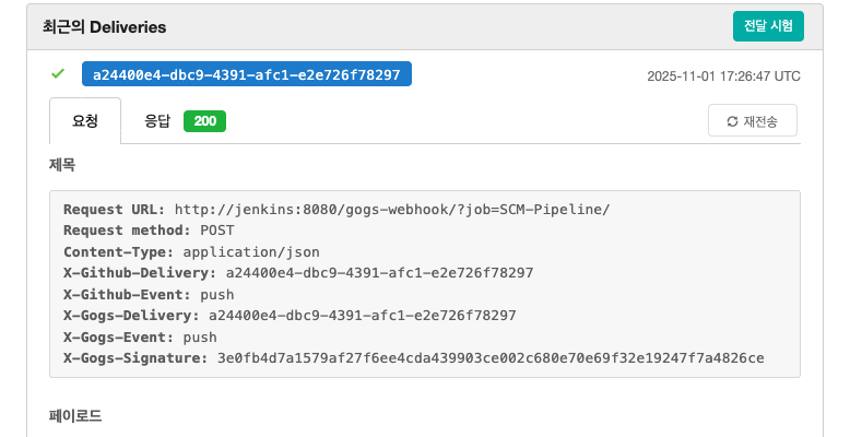 gogs 웹에 접근하여 설정 - webhook을 확인하면 정상적으로 200 코드를 확인 가능합니다.