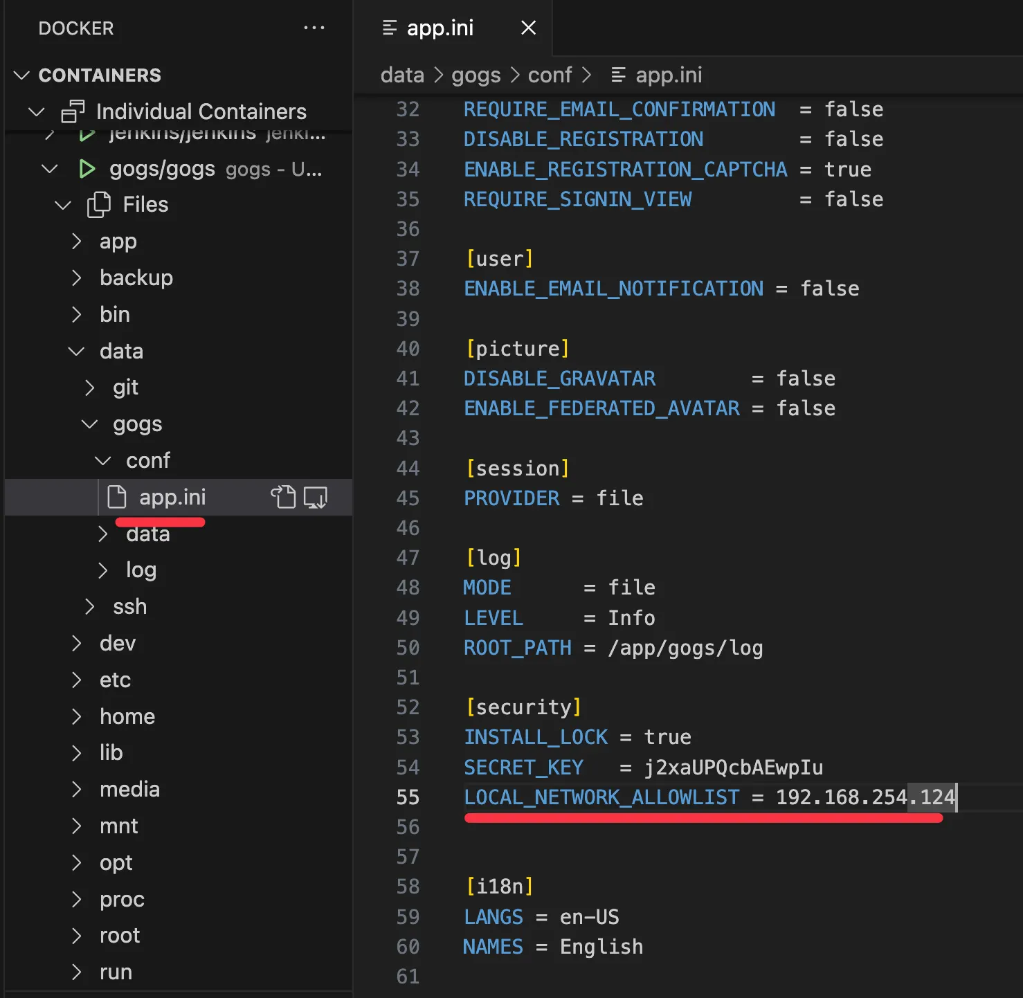 gogs 에 conf/app.ini 파일 수정 후 컨테이너 재기동