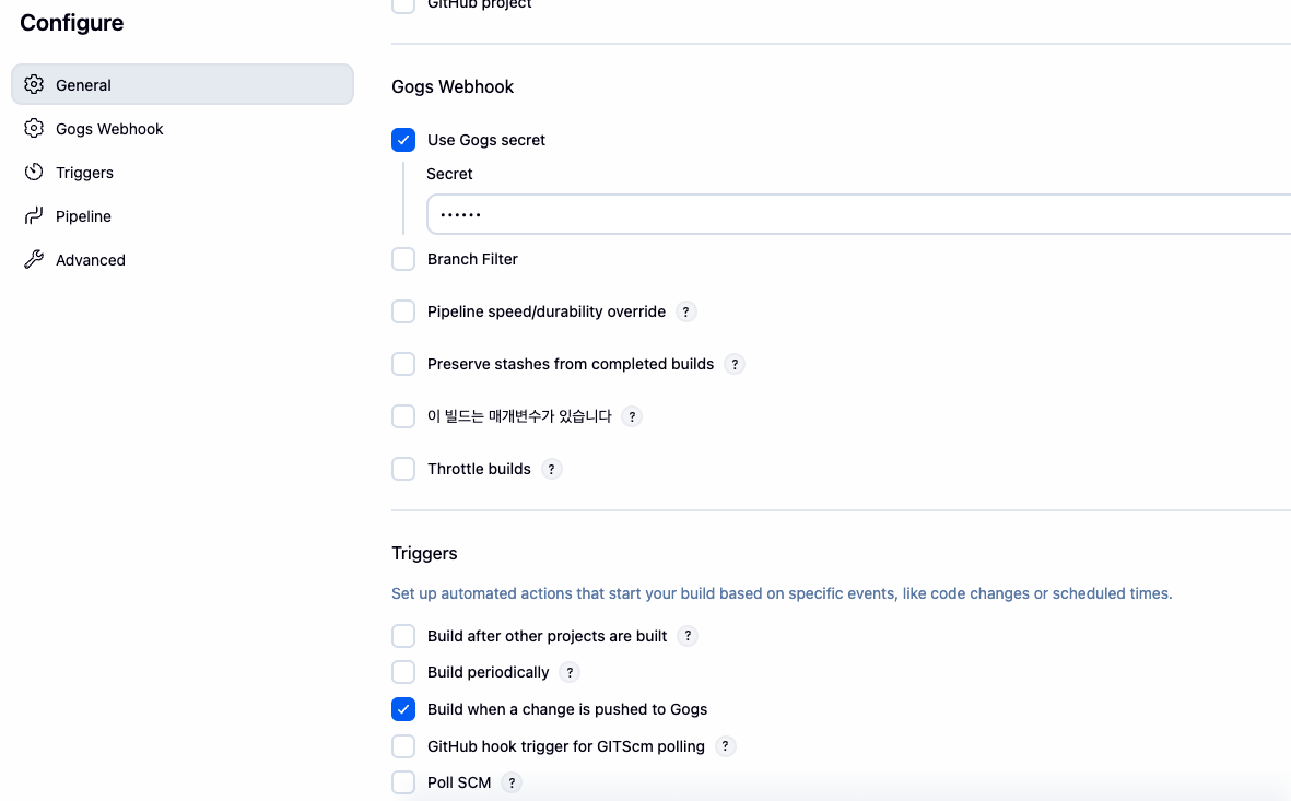 - Build Triggers : Build when a change is pushed to Gogs 체크