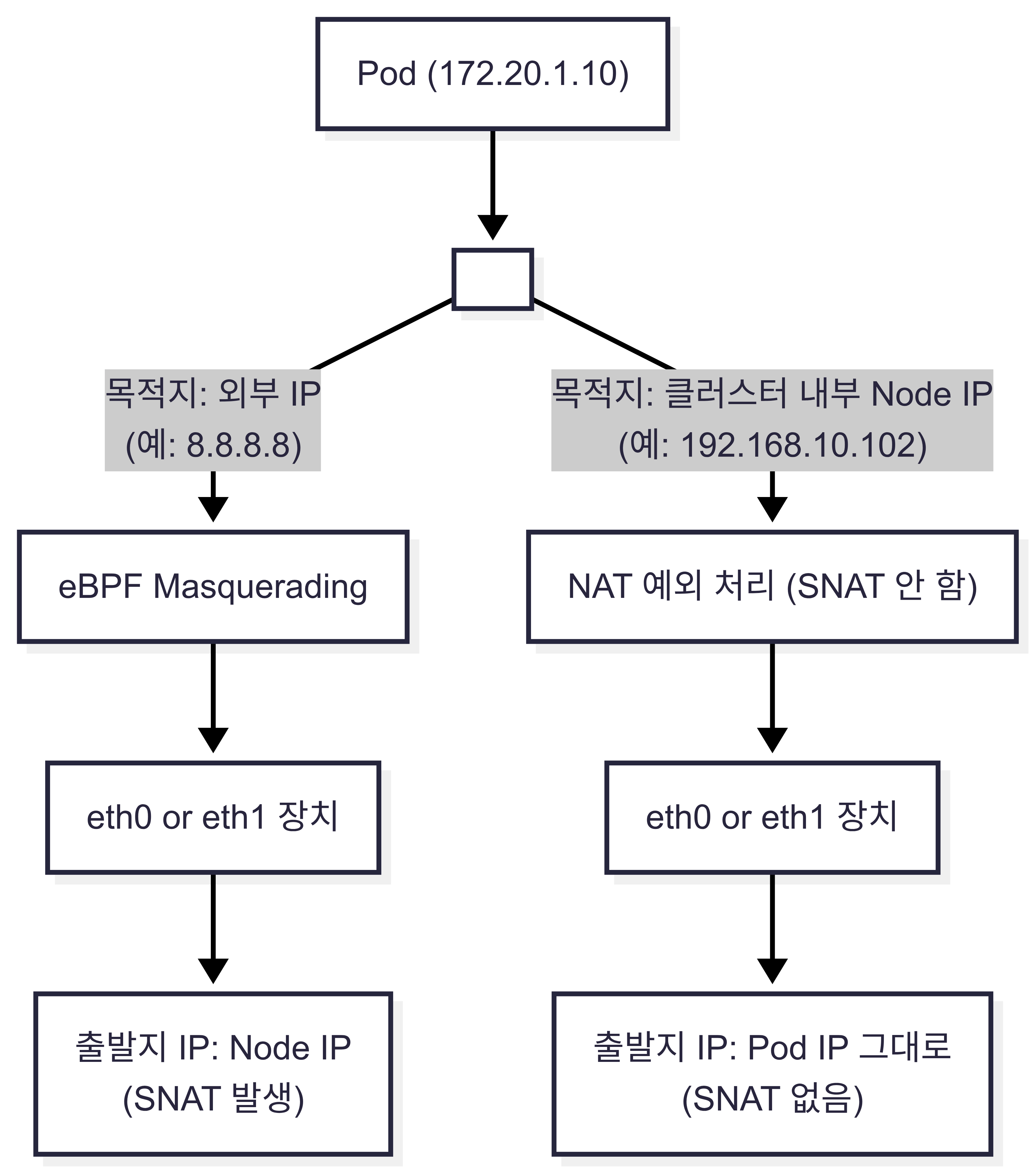 - Cilium이 관리하지 않는 네트워크 인터페이스(예: eth0, ens3)로 나가는 트래픽은 모두 SNAT 처리