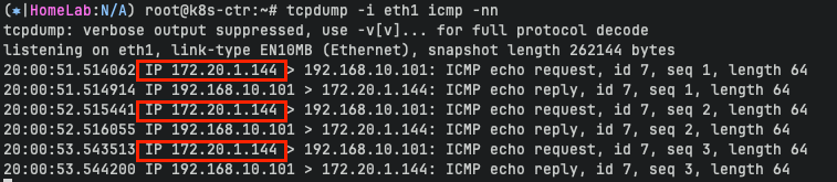 - 이는 출력 장치가 프로그램을 실행하는 경우 포드에서 외부 주소로 전송된 패킷이 Masquerading(출력 장치 IPv4 주소로)된다는 것을 의미합니다.
